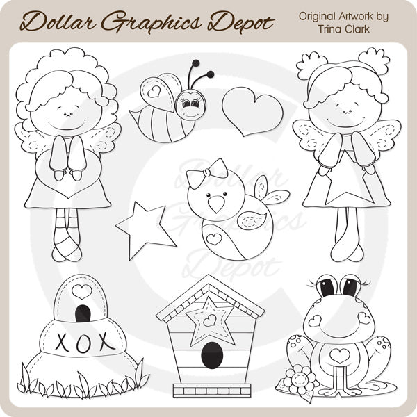 Esta colección incluye un angelito sosteniendo un corazón, un angelito sosteniendo una estrella, una colmena, un abejorro, una casita para pájaros, un pájaro, una rana sobre un nenúfar, una estrella y un corazón. TENGA EN CUENTA: Este conjunto coordina con las colecciones "Summer Days 1 - Clip Art" y "Summer Days 1 - Scrap Papers" . Este conjunto contiene 9 sellos digitales.
