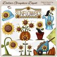 Esta colección incluye un bonito sombrero de jardín con un girasol, una regadera con girasoles y un cuervo negro, una gran cara de girasol, una calabaza con girasoles, una vasija de barro con un girasol y un cuervo negro, girasoles que crecen en la hierba, una carretilla. lleno de tierra y calabazas en una colina cubierta de hierba, un gráfico de arte con palabras "Girasoles" y un fondo de girasol a juego, que se puede ampliar en tamaño para usarlo como documento de fondo o reducir en tamaño para usarlo como mosaico. Este conjunto contiene 10 gráficos.