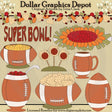 Esta colección incluye una pelota de fútbol, un tazón de fútbol lleno de chips de tortilla, un tazón de fútbol lleno de salsa de queso, un tazón de fútbol lleno de chile, una taza con forma de balón de fútbol, un plato de verduras, cerdos en una manta, un borde a juego, y un gráfico de palabras "Super Bowl". Este conjunto contiene 9 gráficos.