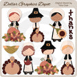 Esta colección incluye peregrinos del Día de Acción de Gracias, pavos, calabazas de otoño, coloridas hojas de otoño, un girasol, una manzana roja, mazorcas de maíz y un gráfico artístico con la palabra "Gracias". Este conjunto contiene 9 gráficos.