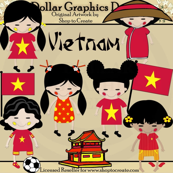 Esta colección incluye seis adorables muñecas vietnamitas, cada una con lindos ojitos de botón, mejillas de colores, bocas cosidas y banderas vietnamitas: una tiene un vestido rojo con una estrella y bonitos palillos para el cabello, otra tiene un traje tradicional Áo dài y un sombrero nón lá. , uno tiene un vestido rojo con lunares y estrellas y bonitos palillos de flores para el cabello, uno tiene un vestido rojo con una estrella y una bandera vietnamita, uno tiene un traje de fútbol rojo y amarillo y un balón de fútbol, y el otro tiene pantalones cortos a cuadros rojos y amarillos. , una camiseta roja, bonitas horquillas florales y chanclas. Esta colección también incluye una bandera vietnamita, un edificio vietnamita y un gráfico con la palabra "Vietnam". Este conjunto contiene 9 gráficos.