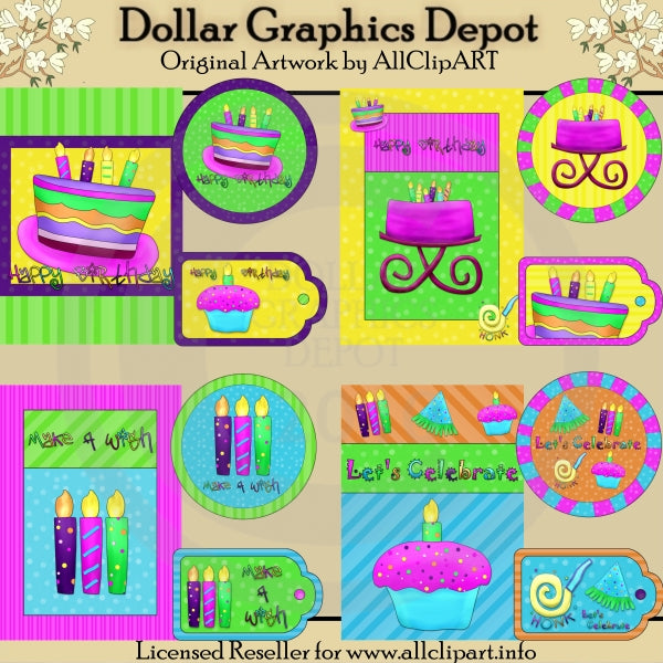 Esta colección incluye cuatro tarjetas de cumpleaños extravagantes de 5 x 7 y cuatro etiquetas y etiquetas de regalo de cumpleaños extravagantes a juego, en azul brillante, verde, amarillo, morado, rosa y naranja, pasteles de cumpleaños, velas, cupcakes, sopladores de fiesta, sombreros de fiesta y arte con palabras. que dice: "Feliz cumpleaños", "Pide un deseo" y "Celebremos". Este conjunto contiene 12 imprimibles.