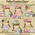 Esta colección incluye seis niñas adorables, que visten bonitos vestidos con estampados de lunares, cuadros vichy, cuadros y flores, y hermosos sombreros de flores y plumas, bolsas de compras, lindos monederos y un cono de helado. Este conjunto contiene 6 gráficos.
