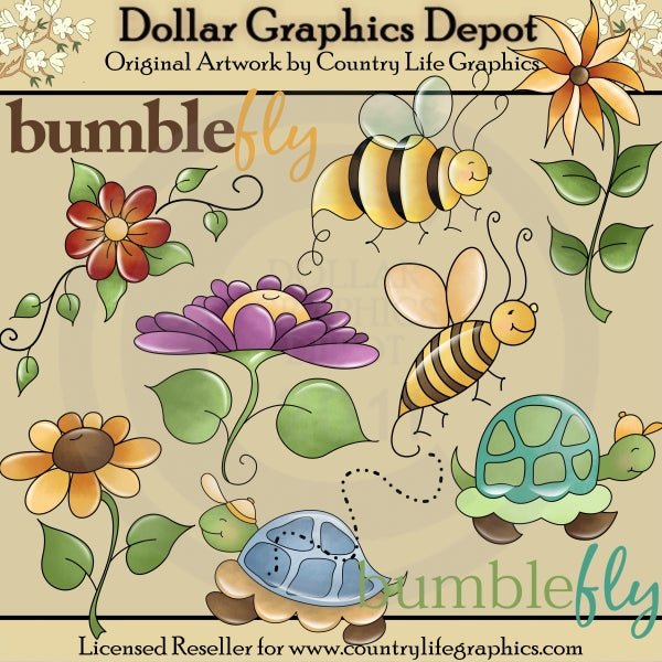 Esta colección incluye hermosas flores rojas, moradas, doradas, naranjas y marrones, lindos abejorros, uno con hermosas alas transparentes, adorables tortugas con sombreros y dos gráficos con palabras "Bumblefly", uno en marrón y dorado y el otro. en verde y agua. Este conjunto contiene 10 gráficos.