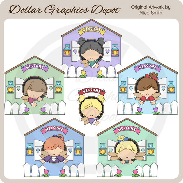Esta colección incluye pequeñas hadas adorables, en pajareras pintadas, con cercas, flores bonitas, contraventanas, linternas y carteles de bienvenida, y un hada con un cartel de "Bienvenida". Este conjunto contiene 6 gráficos.