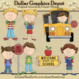 Esta colección única solo está disponible en Digital Craft Supplies. Este conjunto incluye un autobús escolar y un conductor, un niño y una niña esperando en la parada del autobús, un niño y una niña caminando hacia la escuela y una niña con su mochila, todos vestidos con jeans, faldas y camisetas, en rojo, azul, morado, amarillo y verde, y un gráfico de lápiz y palabra de manzana "Bienvenido de regreso a la escuela". Este conjunto exclusivo contiene 6 gráficos.