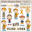 Esta colección única solo está disponible en Digital Craft Supplies. Este conjunto grande incluye a un niño pequeño "Brandon", vestido con pantalones cortos marrones, una camisa a rayas azules y naranjas, zapatos azules y una gorra de béisbol naranja, un niño pequeño con pantalones cortos marrones, una camisa azul con una raya naranja, zapatos naranjas y una gorra de béisbol naranja, una niña con pantalones cortos de mezclilla, una camisa roja con una raya naranja, zapatos rojos y una diadema a juego, una niña con falda naranja, camiseta roja, suéter azul, zapatos azules y lazos para el cabello a juego , tres niños pequeños "Brandon", cada uno sosteniendo una cinta naranja de concientización sobre la leucemia: uno con la palabra "Fe", otro con la palabra "Esperanza" y otro con la palabra "Fuerza", una cinta naranja de concientización sobre la leucemia, una leucemia naranja cinta de concientización con la palabra "Leucemia - Encuentre una cura" y cinco gráficos de palabras: "ESPERANZA CURA POR LA FE", (2) "Ayúdenos a encontrar una cura para la LEUCEMIA", "Encuentre una CURA" y "Ten FE en Dios". ". TENGA EN CUENTA: Este conjunto coordina con la colección "Brandon del equipo de concientización sobre la leucemia - Sellos digitales" . Este conjunto exclusivo contiene 14 gráficos.