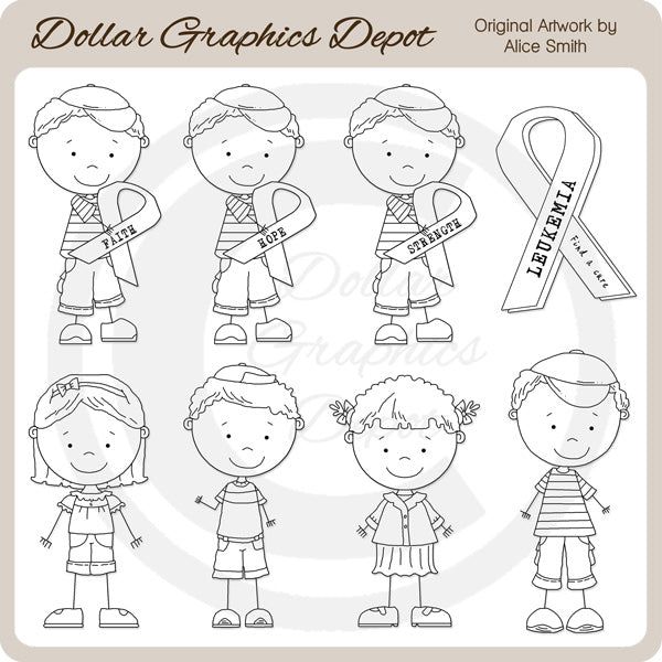 Esta colección única solo está disponible en Digital Craft Supplies. Este conjunto incluye un niño "Brandon", con pantalones cortos, una camisa a rayas, zapatos y una gorra de béisbol, un niño con pantalones cortos, una camisa con una raya, zapatos y una gorra de béisbol, una niña con pantalones cortos, un camisa con volantes con una raya, zapatos y una bonita diadema, una niña que llevaba una falda, una camiseta, un suéter, zapatos y bonitos lazos para el cabello, tres niños pequeños "Brandon", cada uno sosteniendo una cinta de concientización sobre la leucemia, uno con Arte con palabras "Fe", uno con arte con palabras "Esperanza" y otro con arte con palabras "Fuerza", y una cinta de concientización sobre la leucemia con arte con palabras "Leucemia - Encuentre una cura". TENGA EN CUENTA: Este conjunto coordina con la colección "Brandon del equipo de concientización sobre la leucemia - Clip Art" . Este exclusivo set contiene 8 sellos digitales.