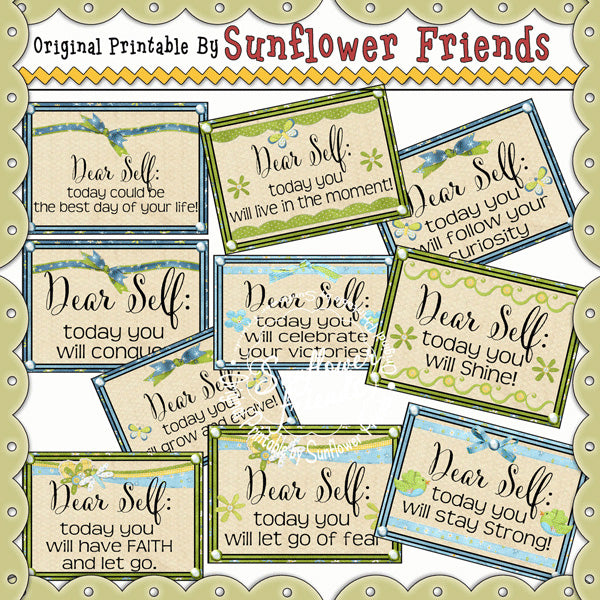 Este juego contiene 10 tarjetas/imanes de bolsillo "Dear Self" en 2 tamaños diferentes.