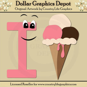 Esta colección incluye archivos de corte que se pueden usar para crear este proyecto educativo de manualidades con letras del alfabeto (que se muestra "terminado" en la vista previa): I es para helado: la letra "I" y un cono de helado de triple bola.