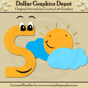 Esta colección incluye archivos de corte que se pueden usar para crear este proyecto educativo de manualidades con letras del alfabeto (que se muestra "terminado" en la vista previa). S es para el Sol: la letra "S" y nubes hinchadas con un sol sonriente.