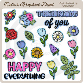 Esta gran colección incluye dos bonitos ramos de flores, cuatro tulipanes coloridos, una rosa roja, una margarita, una lila, una flor morada, una flor rosa, un girasol, una hoja, una rama de hoja y dos gráficos con palabras: "Pensando en Tú" y "Feliz todo". Este conjunto contiene 16 gráficos.