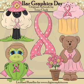 Esta colección incluye un lunar rosa y blanco, una cinta de concientización sobre el cáncer de mama, una oveja parada en un trozo de hierba, con un bonito sombrero de lunares de color rosa y blanco, y una cinta de concientización rosa, un cupcake rosado esmerilado, con una cinta de concientización rosa. una rana manchada, con sombrero color topo y lazo rosa, y una cinta rosa de concientización, y un osito de peluche, con un bonito vestido rosa, una maceta de barro con flores rosas y una cinta rosa de concientización. Este conjunto contiene 5 gráficos.