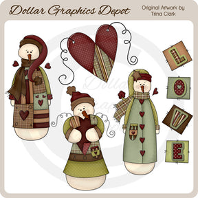Esta colección incluye adorables muñecos de nieve de San Valentín con abrigos, gorros y bufandas de invierno de retales, un corazón de retazos con alambre rizado y un gráfico artístico con la palabra "Amor" hecho con parches. Este conjunto contiene 5 gráficos.
