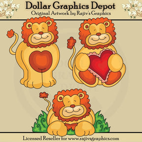 Esta colección incluye tres pequeños leones: uno de pie, otro sentado con un corazón festoneado y otro tumbado en la hierba. Este conjunto contiene 3 gráficos.