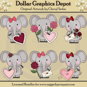 Esta colección incluye seis adorables elefantes de San Valentín, rosas rojas y rosadas, corazones de San Valentín rojos y rosas y tarjetas de San Valentín en sobres. Este conjunto contiene 6 gráficos.