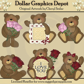 Esta colección incluye seis ositos adorables, rosas rojas y rosadas de tallo largo, un bonito cartel que dice "Te amo" y un marco festoneado con un bonito lazo, para que puedas personalizar. Este conjunto contiene 6 gráficos.