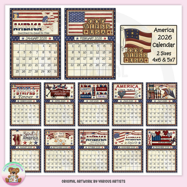 Esta colección única solo está disponible en Digital Craft Supplies. Esta colección incluye un calendario americano patriótico de 12 meses, 2024, en dos tamaños diferentes (4" x 6" y 5" x 7"), con doce diseños diferentes de EE. UU. y refranes americanos. Este conjunto exclusivo contiene 24 imprimibles individuales (12 se muestran en la vista previa) y 10 páginas "listas para imprimir" (no se muestran en la vista previa).