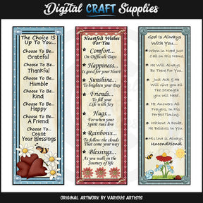 Esta colección única solo está disponible en Digital Craft Supplies. Esta colección incluye tres marcadores alentadores diferentes de 2" x 6,25": "La elección depende de ti", "Deseos sinceros para ti" y "Dios está siempre contigo". Consulte la vista previa para conocer la redacción. Este conjunto exclusivo contiene 3 imprimibles individuales y 3 páginas "listas para imprimir" (no se muestran en la vista previa).