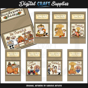 Esta colección única solo está disponible en Digital Craft Supplies. Esta colección incluye siete mini envoltorios para barras de chocolate "Acción de Gracias" y un adorno para bolsa a juego de 3 x 4. Los diseños incluyen: un fondo de cuadros, peregrinos, indios, osos peregrinos, osos indios, una mesa de madera, calabazas de otoño, calabazas, coloridas hojas de otoño, un pavo asado, pasteles recién horneados, mazorcas de maíz, cestas de manzanas rojas, heno, bellotas, un sombrero de peregrino, un letrero de madera que dice "Dar gracias", hermosos colores otoñales, pavos de Acción de Gracias, sombreros de peregrino, calabazas de otoño, ositos lindos, un letrero de "Feliz Día de Acción de Gracias", pavos y una carreta roja. El arte de palabras y el texto incluyen: "Sea agradecido", "Feliz Día de Acción de Gracias", "Dé gracias" y "Seamos agradecidos porque nuestras bendiciones son muchas". Este conjunto exclusivo contiene 8 imprimibles individuales y 2 páginas "Listo para imprimir" (no se muestran en la vista previa).