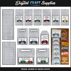 Esta colección única solo está disponible en Digital Craft Supplies. Esta colección incluye seis envoltorios para mini barras de caramelo, una bandeja para contener cuatro mini barras de caramelo, una bandeja para contener seis mini barras de caramelo, dos adornos para bolsas de mini barras de caramelo y un adorno para bolsa de 3 x 4 a juego (se adapta a las bolsas para manualidades de 3 x 4) , un adorno de bolsa de 4 x 4 a juego (se adapta a las bolsas para manualidades de 4 x 6) y una etiqueta de regalo a juego en dos tamaños (no se muestra el tamaño más grande; funcionan bien si no desea usar las bandejas... simplemente coloque las mini barras de chocolate envueltas en una bolsa de celofán, atadas con listón o yute y agregando una etiqueta de regalo). Los diseños incluyen coches y camiones de colores (excepto las dos bandejas). Los seis envoltorios de mini barras de chocolate tienen el siguiente texto: "Eres el mejor papá que cualquiera podría tener", "Un papá es alguien a quien admiras sin importar lo alto que crezcas", "Un papá tiene fotos en el bolsillo donde El dinero solía serlo", "Eres el padre más devoto y apuesto", "El regalo más grande que he recibido de Dios... Lo llamo papá" y "Un papá ama sin condiciones". Los adornos de las bolsas tienen el siguiente texto: "Para el papá más grande del mundo". Las etiquetas de regalo tienen el siguiente texto: "Para el mejor papá del mundo". Este conjunto exclusivo contiene 14 imprimibles de gramos de dulces individuales (envoltorios, bandejas, adornos y etiquetas) y 7 páginas "Listas para imprimir" (no se muestran en la vista previa).