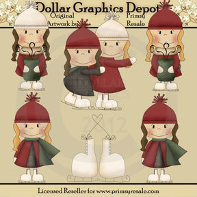 Esta colección incluye seis patinadoras sobre hielo con patines para hielo, abrigos de invierno, gorros, bufandas, tazas de chocolate caliente y un par de patines para hielo por separado. Este conjunto contiene 6 gráficos.
