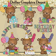 Esta colección incluye seis adorables ositos de peluche, con coloridos sombreros de fiesta, globos de cumpleaños, regalos envueltos con bonitos lazos, un pastel de cumpleaños decorado con una vela de cumpleaños, pastelitos glaseados con chispas, un helado con una cereza encima, un helado. cono, galletas heladas, confeti de fiesta y dos gráficos con palabras: "Feliz cumpleaños" y "Deseos de cumpleaños". Este conjunto contiene 8 gráficos.