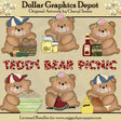 Esta colección incluye seis adorables ositos de peluche, los niños tienen gorras de béisbol y las niñas tienen diademas florales, una canasta de picnic, una fresa, un pepinillo, frascos de mostaza, una jarra de limonada, un vaso de limonada con pajita, una botella de salsa de tomate, un frasco de pepinillos, un plato de papas fritas, una rodaja de sandía, hormigas de picnic, un muslo de pollo y la palabra "Teddy Bear Picnic". Este conjunto contiene 7 gráficos.
