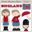 Esta colección incluye un niño británico, una niña británica, una bandera británica, un paraguas, un soldado británico y un gráfico con la palabra "Inglaterra". Este conjunto contiene 6 gráficos.