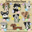 Esta colección incluye nueve cachorros de Pascua, en marrón, tostado, blanco, negro y gris, un bonito lazo rosa, un hueso de perro, huevos de Pascua de colores y bonitos narcisos y tulipanes. Este conjunto contiene 9 gráficos.