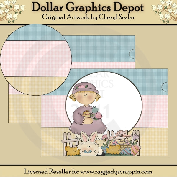 Esta colección incluye un juego de latas de pintura de un galón: envoltorio frontal, envoltorio trasero y tapa, un fondo tricolor: cuadros azules, cuadros rosas y cuadros dorados, una silueta ovalada blanca, una bonita niña de Pascua, un conejito y pollitos. , abejorros, huevos de Pascua de colores, un trozo de césped, una valla, bonitos tulipanes y una cesta de Pascua llena de huevos de Pascua pintados. Este juego contiene 3 envoltorios.