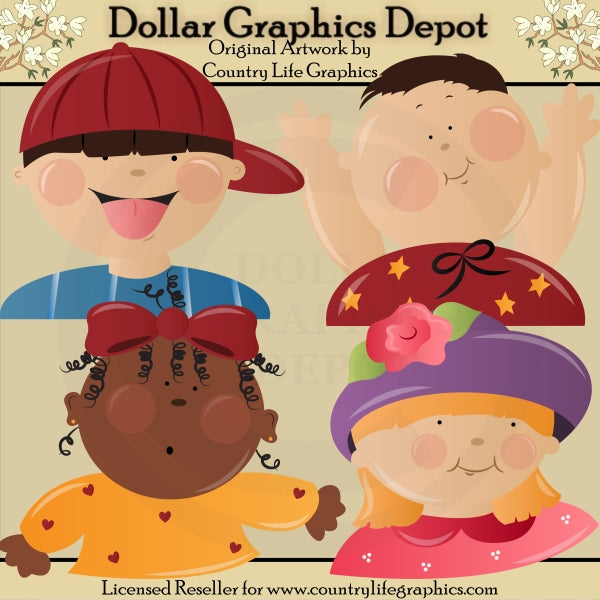Esta colección incluye cuatro niños felices: un niño con una camisa a rayas azules y una gorra de béisbol roja, un niño con una camisa roja y estrellas doradas, una niña con una blusa dorada con pequeños corazones rojos y un bonito lazo rojo para el cabello. y una niña con una bonita blusa rosa con lunares y un gorro morado con flor rosa. Este conjunto contiene 4 gráficos.