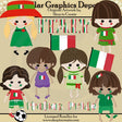 Esta colección incluye seis adorables muñecas italianas, cada una con lindos ojitos de botón, mejillas de colores, bocas cosidas y banderas italianas: una tiene un bonito vestido verde y un sombrero rojo y verde, una tiene un bonito vestido verde y rojo, una tiene un traje rojo, blanco y verde y un balón de fútbol, uno tiene un bonito vestido morado, otro tiene un bonito vestido verde y el otro tiene un bonito traje verde, chanclas y un lazo para el cabello rojo, blanco y verde. Esta colección también incluye dos gráficos con palabras: "Italia" y "Orgullo italiano", y una bandera italiana. Este conjunto contiene 9 gráficos.