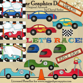 Esta gran colección incluye seis coloridos autos de carreras, tres cascos de carreras, una bandera a cuadros, un cono naranja, llaves del auto, letras "Let's Race", dos letreros de carreras: "Vroom" y "Race Day", y tres de 5" x 7". Frentes de cartas de coches de carreras. Este conjunto contiene 18 piezas (15 gráficos y 3 imprimibles).