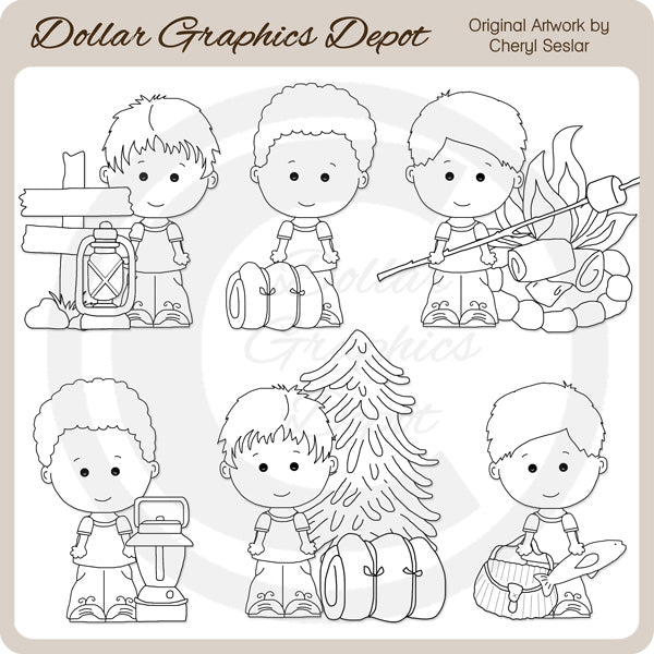 Esta colección incluye adorables niños pequeños que acampan con linternas para acampar, un letrero de madera para el sendero, parches de césped, rocas, sacos de dormir, una fogata de adoquines, un malvavisco en un palo, un pino, un pez y una bolsa de pesca. Este conjunto contiene 6 sellos digitales.