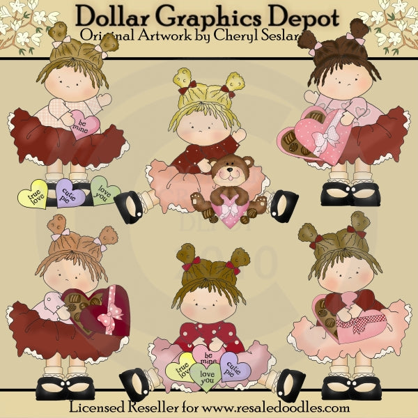 Esta colección incluye seis niñas adorables, que llevan hermosos vestidos estampados y lazos para el cabello a juego, corazones de conversación, dulces de chocolate, cajas de chocolate en forma de corazón, con bonitos lazos y un lindo osito de peluche. Los colores incluyen: rojo, rosa, blanco, tostado, morado, verde, amarillo, marrón y negro. Este conjunto contiene 6 gráficos.