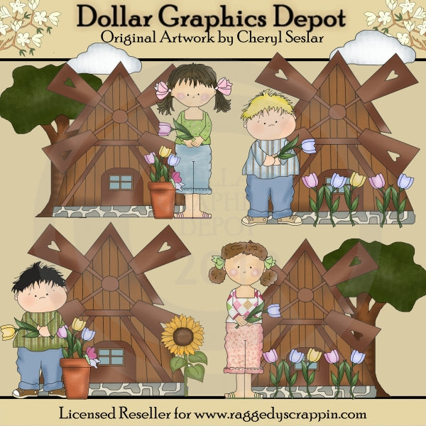 Esta colección única solo está disponible en Digital Craft Supplies. Este conjunto incluye dos niñas vestidas con bonitos trajes y lazos a juego, dos niños pequeños con vaqueros y camisas a rayas, cuatro pequeños molinos de viento holandeses con detalles en forma de corazón y bordes de adoquines, bonitas macetas, mariposas, árboles, un girasol y muchos bonitos tulipanes. en rosa, morado y amarillo. Este conjunto exclusivo contiene 4 gráficos.