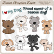 Esta colección incluye adorables perritos de rescate, en muchos colores diferentes, y dos gráficos de palabras a juego: "I Love My Dog" y "Proud Owner Of A Rescue Dog". Este conjunto contiene 10 gráficos.