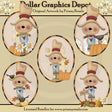 Esta colección incluye cinco bonitos óvalos enmarcados en naranja y negro, con simpáticos ositos espantapájaros, calabazas de otoño, tallos de maíz, bonitas margaritas, coloridas hojas de otoño, una valla, cuervos negros, calabazas, bellotas y un letrero de madera que dice: "Feliz otoño". ". Este conjunto contiene 5 gráficos.