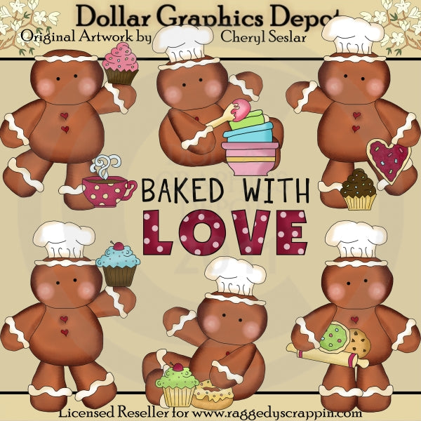 Esta colección incluye seis adorables hombrecitos de jengibre con adornos de glaseado, gorros de chef, una taza pintada llena de café caliente, pastelitos glaseados con chispas, una pila de tazones para mezclar, una cuchara de madera con glaseado rosa, galletas decoradas, un donut glaseado, un rodillo y un gráfico con la palabra "Baked With Love". Este conjunto contiene 7 gráficos.