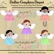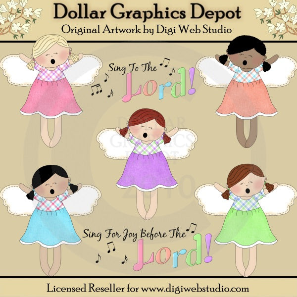 Esta colección incluye cinco angelitos dulces, vestidos con bonitas blusas a cuadros y faldas coloridas, en rosa, morado, aguamarina, melocotón, verde y azul, y dos gráficos de palabras con notas musicales: "Sing To The Lord" y "Sing To The Lord". Para gozo delante del Señor." Este conjunto contiene 7 gráficos.