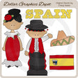 Esta colección incluye un niño español, una niña española, un sombrero, una bandera española y un gráfico con la palabra "España". Este conjunto contiene 5 gráficos.