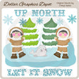 Esta gran colección incluye una niña esquimal, un niño esquimal, un estanque de hielo, pinos nevados, una pequeña foca, copos de nieve y dos gráficos con palabras: "Up North" y "Let It Snow". Este conjunto contiene 13 gráficos.
