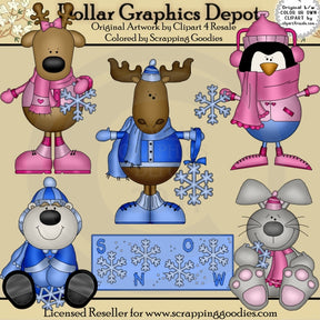 Esta colección incluye un reno, un alce, un pingüino, un oso y un conejito, con abrigos de invierno, sombreros, bufandas, orejeras, manoplas y pequeños copos de nieve, y un gráfico invernal con la palabra "Nieve". Los colores incluyen: rosa, azul, marrón, negro, blanco, gris y carbón. Este conjunto contiene 6 gráficos.
