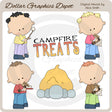 Questa collezione include adorabili ragazzini e ragazze, un piatto di S'mores, scatole di cracker Graham, barrette di cioccolato, sacchetti di marshmallow, un marshmallow su un bastoncino, un falò e una grafica word art "Campfire Treats". Questo set contiene 6 grafici.
