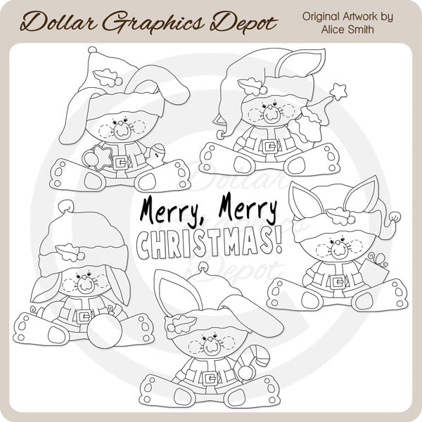 Questa collezione unica nel suo genere è disponibile solo presso Digital Craft Supplies. Questo set include adorabili coniglietti di Natale, vestiti con abiti e cappelli di Babbo Natale, biscotti natalizi ritagliati, un albero di Natale, ornamenti natalizi, un bastoncino di zucchero, un regalo di Natale incartato e una grafica word art "Buon, buon Natale". Questo set esclusivo contiene 6 timbri digitali.