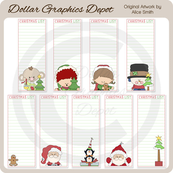 Questa collezione comprende nove fogli di cartoleria "Lista di Natale", con Babbo Natale (2), un omino di pan di zenzero, una ragazza elfa con un omino di pan di zenzero, un ragazzo elfo con un albero di Natale, un topo con un albero di Natale e ornamento, un pupazzo di neve con un albero di Natale, pinguini seduti sopra un regalo di Natale e un albero di Natale con una stella d'oro in cima. Questo set contiene 9 fogli di cancelleria.