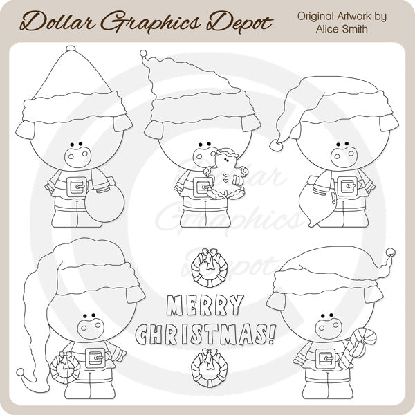 Questa collezione unica nel suo genere è disponibile solo presso Digital Craft Supplies. Questo set include adorabili maialini di Natale, vestiti con abiti e cappelli di Babbo Natale, un ornamento natalizio, un omino di pan di zenzero, una lampadina natalizia, una ghirlanda natalizia, un bastoncino di zucchero e una grafica word art "Buon Natale". Questo set esclusivo contiene 6 timbri digitali.