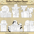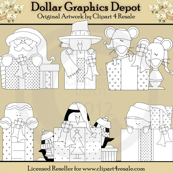 Questa collezione include Babbo Natale con un cappello da Babbo Natale, un pupazzo di neve con un cappello e una sciarpa invernali, topi con maglioni e cappelli invernali, un omino di pan di zenzero con decorazioni di glassa, pinguini con cappelli e sciarpe invernali, un elfo con un cappello da elfo e tanti altri regali di Natale incartati con graziosi fiocchi. Questo set contiene 6 timbri digitali.