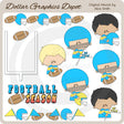 Questa collezione include giocatori di football con uniformi blu e dorate, caschi, palloni da calcio, gagliardetti "Go Team", un palo della porta con il pallone, la scritta "Stagione calcistica" e due bordi di calcio coordinati. Questo set contiene 10 grafici.